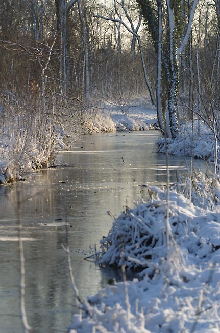 One of the many small artificial streams of the Vincennes wood near Paris. An unusual sight since it is really seldom frozen.