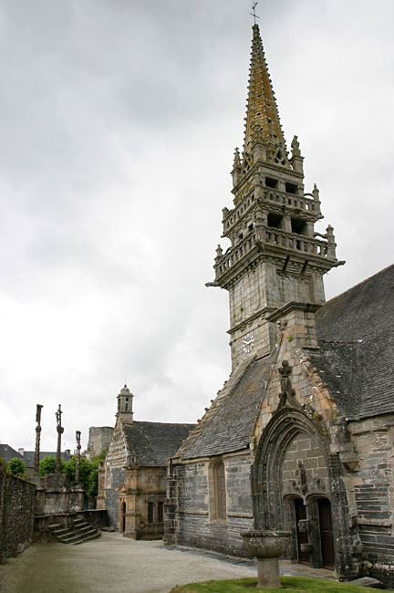 A general view of the parish close of La Roche Maurice with the church, entrance and ossuary. The small graveyard is behind the church. As you can see from the grey skies, Brittany can be very cloudy in May.