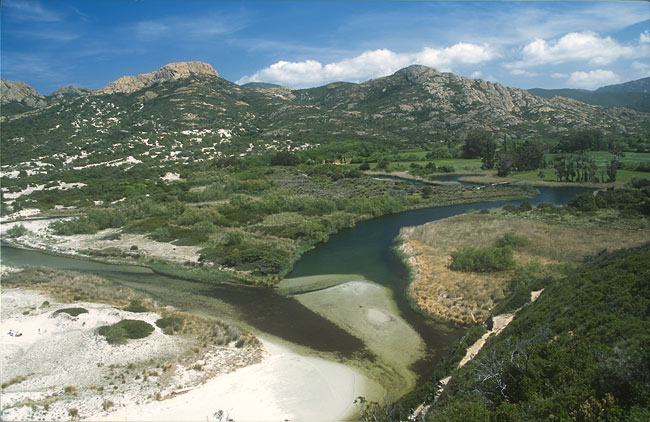 The marshes of the Ostriconi river mouth as seen from the road above. A small path goes down to the river mouth, which has to be crossed on foot in order to access the beach itself. Fortunately, it is very shallow and can be forded easily.