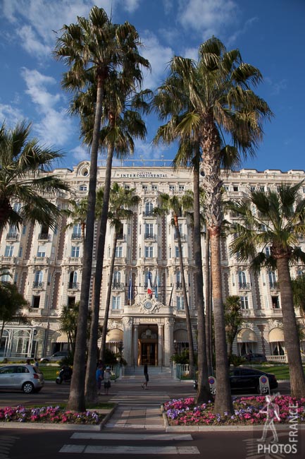 Tall palm trees mark the main entrance of the Carlton hotel on the Croisette boulevard. Also note the palms on the ground, near the pedestrian crossing.