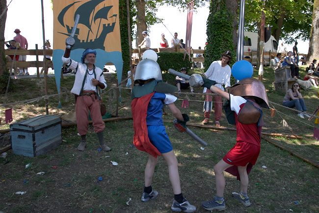 Numerous games of all kinds were organized at the Provins medieval fair. In this particular one, children had a small balloon tied on a helmet on their heads and were to smash the oponent's balloon with a kind of mace. They were fighting fiercely as the balloons were hard to destroy.